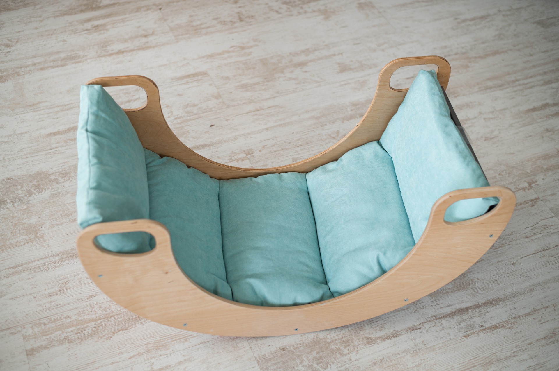 Mérete összeszerelt álapotban : 90x48x45 cm. A szivárvány hintaszék nyírfa rétegelt lemezből készült, és vízbázisú lakkal és festékkel van bevonva, így biztonságos a gyerekek számára.