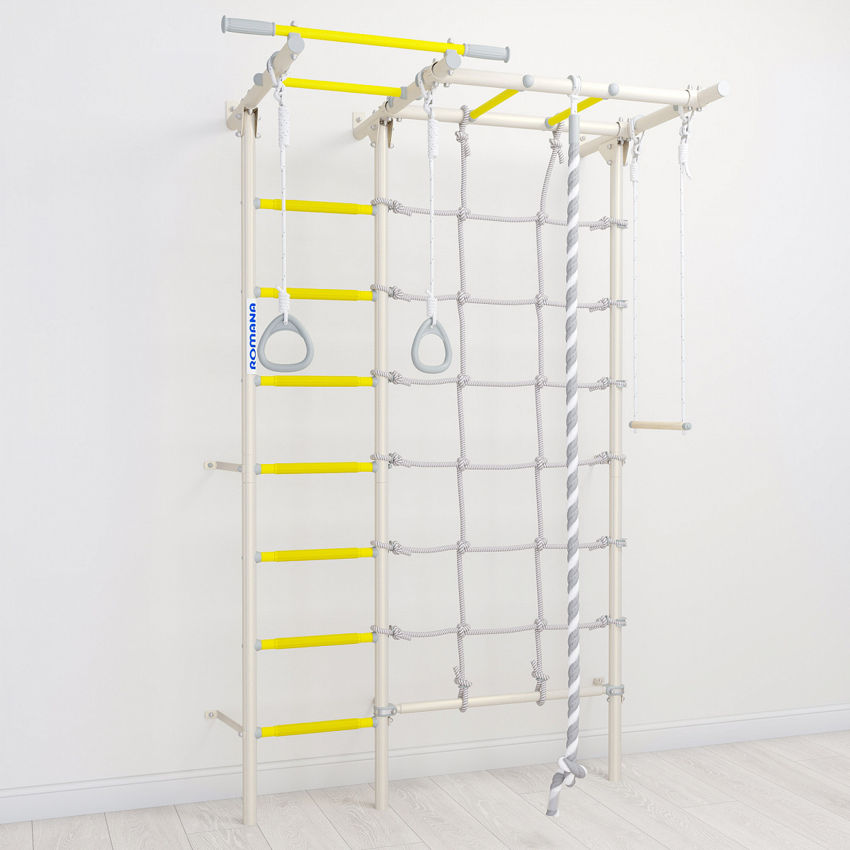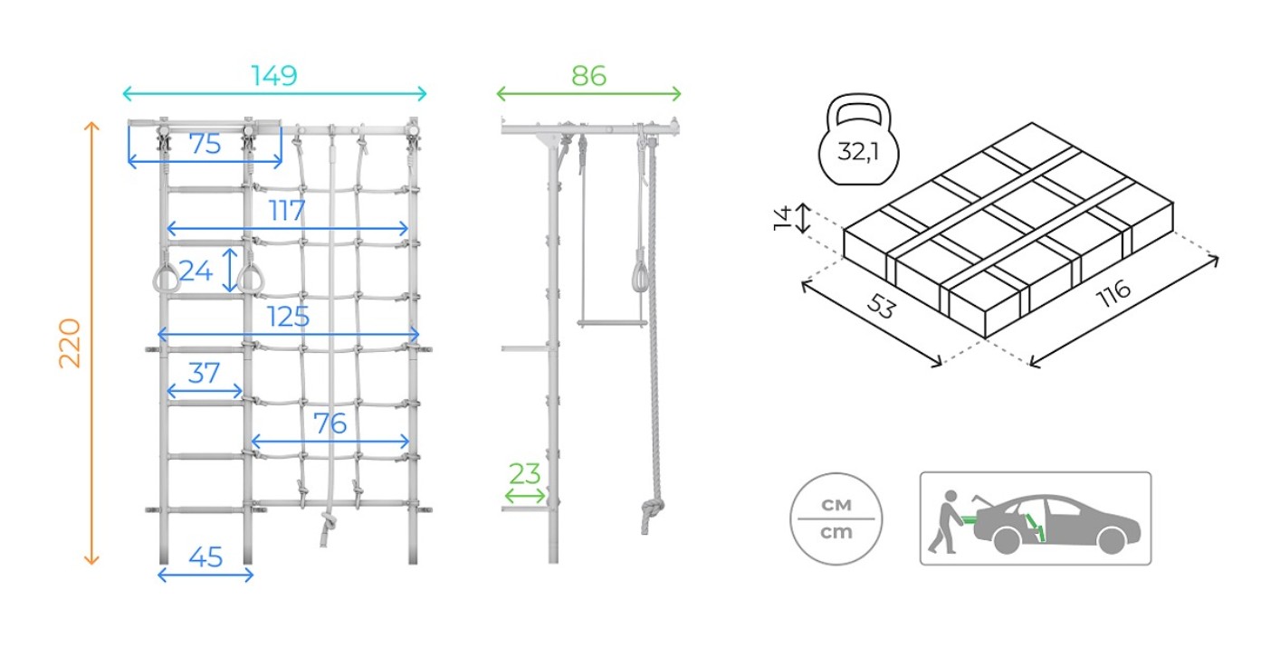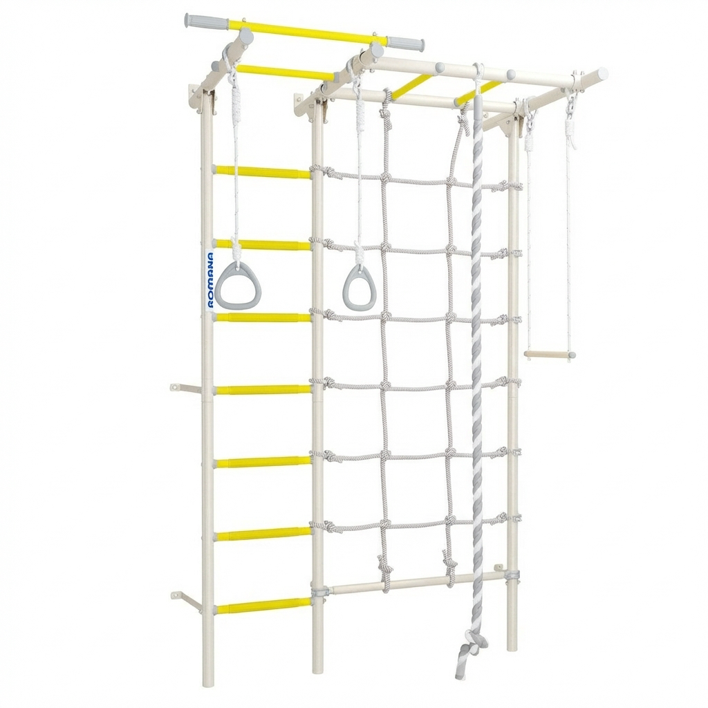 A komplexum minőségi anyagokból készült, stabil és tartós szerkezettel rendelkezik, amely hosszú élettartamot és megbízható használatot biztosít. Többféle elemmel van felszerelve, mint például húzódzkodórúd, mászóháló, trapéz, kötél és tornagyűrűk, így változatos gyakorlatok végzését teszi lehetővé. Ennek köszönhetően a bordásfal nemcsak gyermekek, hanem felnőttek számára is kiváló választás.