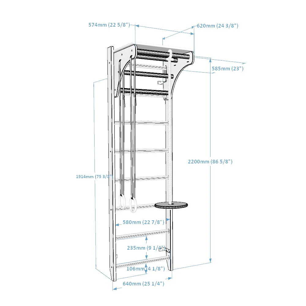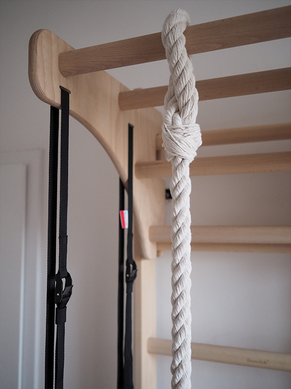 A teljesen fából készült bordásfal pótolhatatlan felszerelés mindenkinek, aki meg akarja erősíteni az ínszalagokat és az inakat, ami szükséges azok számára, akik sportolni akarnak és jó fizikai állapotban vannak. Minőségi bükkfából készül, modern berendezéseken, amely biztosítja a sima fafelületet és a bordásfal tökéletesen illeszkedő részeit. A fa fizikai aktivitás során történő megóvása érdekében a fa elemeit speciális olaj borítja. Ennek a bevonatnak köszönhetően nem csúsznak a kéz válaszfalaiira, és mindig tiszták maradnak. A gyermek szülei a bordásfalon is gyakorolhatnak. A testmozgás és a szórakozás a létrán remek ötlet a családdal való eltöltésre. A maximális terhelés 120 kg. A bordásfal 8 válaszfalakkal rendelkezik, ennek köszönhetően nem sok helyet foglal el, és könnyen elfér egy kis gyermekszobában. Elég, ha csak 0,5 m2 helyet szánunk a telepítésre. A fa húzodzkodó állítható, így lehetővé teszi a különböző izomterületek edzését. Minden elem jól elkészült, nincsenek éles élei vagy kiálló részei. A gyártás során olyan természetes anyagokat használnak, amelyek nem okoznak allergiás reakciókat. A torna megfelel a PN-EN 12346: 2001, PN-EN 913: 2019-03 szabványoknak. A tábla / asztal bükkfából készült. A fa húzodzkodóra Pull up bar PB204 kerül és így stílusos és funkcionális asztalt hoz létre.A tábla / asztal a legjobb minőségű olajjal van olajozva. A bordásfalon lévő húzodzkodó magasságának köszönhetően ez az asztal a felhasználó magasságához is igazítható. Tényleg bárki használhatja, akár gyermek, akár felnőt A torna-kiegészítők ösztönzést jelentenek az új kihívások és a fizikai aktivitás elfogadására. A kiegészítő készlet tartalmaz: pár tornagyűrűt, mászókötelet fa hintával. A kiegészítőket legfeljebb 80 kg súlyú emberek használhatják. A tornagyűrűk bükkfa rétegelt lemezből készülnek, és fekete csíkokra vannak akasztva. Az övek csattal vannak ellátva, amely lehetővé teszi hosszúságuk gyors beállítását, valamint könnyű szétszerelést. A csat mellett tépőzár található, amelyben visszatekerheti az öv feleslegét. A 100% -ban természetes pamutból készült kötelet kézzel kötik össze a létra tetején, és rögzítik az aljához, így a fém vagy műanyag nem kerül felhasználásra. A kötél használható mászásra vagy hintára.