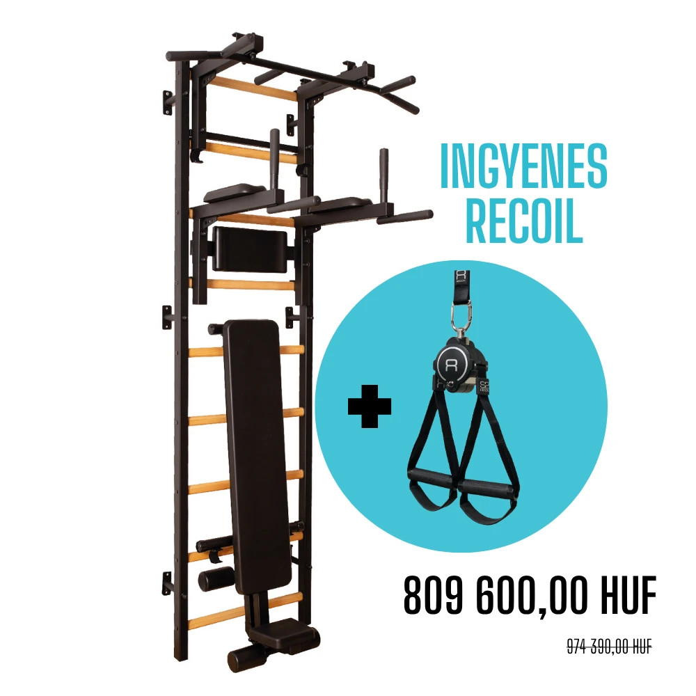 A szett tartalma: bordásfal (tornaszertár), állítható acél húzódzkodó rúd 6 markolattal (súlyzótartóként is használható), tolódzkodó karok háttámlával, edzőpad